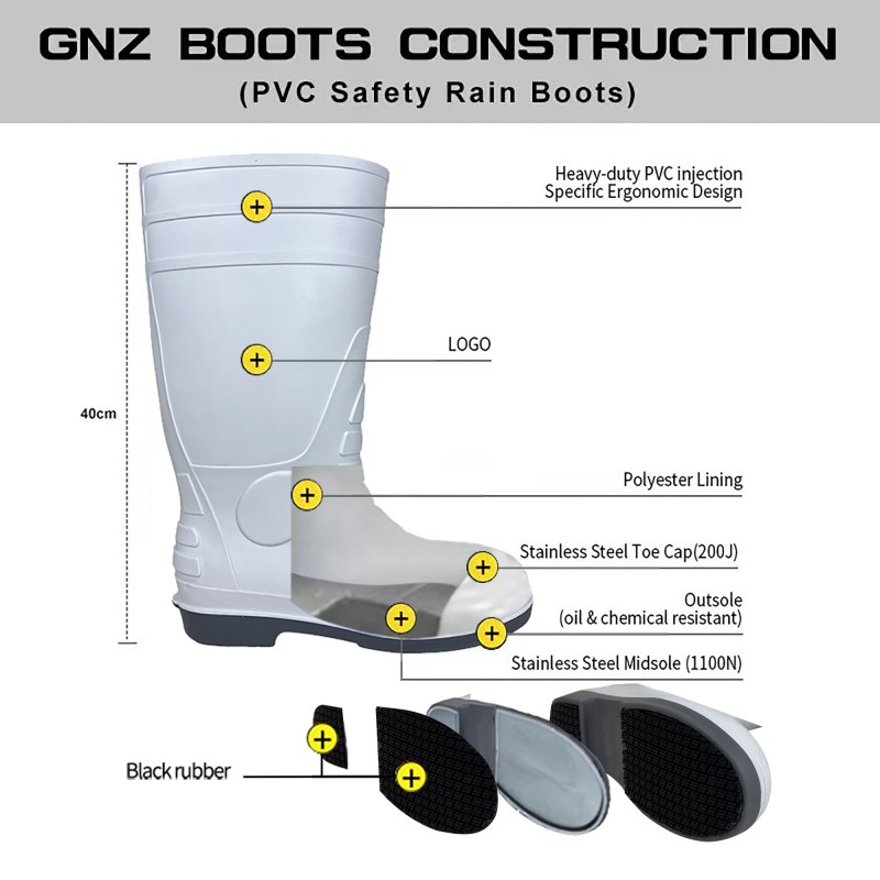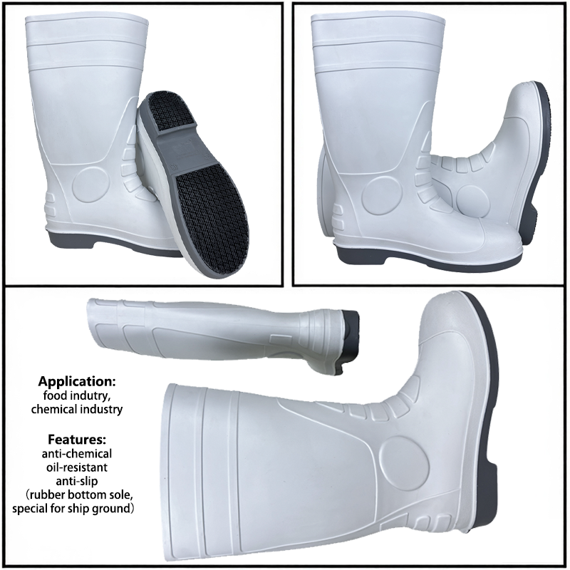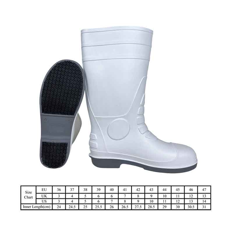 | Chemical resistant | White food-grade rain boots are engineered with acid and alkali-resistant materials, to withstand harsh chemical exposures in food processing environments. Their specialized formulation creates a dense, impermeable barrier that repels a wide range of acidic and alkaline substances—including citrus juices, vinegar, cleaning detergents. |
